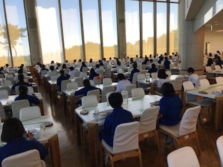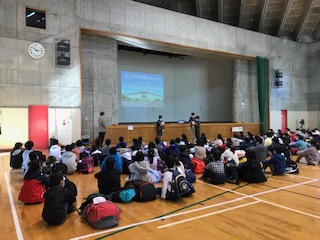 オリエンテーションは、感染予防のため、体育館で行いました。