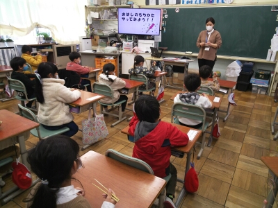 ぱくぱくカードを使って箸の正しい持ち方と動かし方を練習したり、食事中の姿勢や好き嫌いなく食べることの大切さ等について教えていただきました。