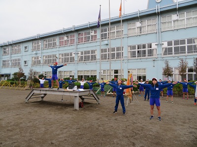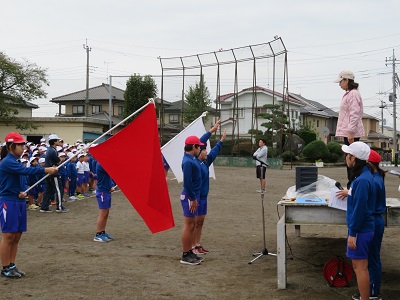 入場行進、国旗掲揚、優勝旗・準優勝杯の返還、選手宣誓、ラジオ体操、退場の練習をしました。
