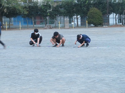 まっすぐ歩けるように、先生達が校庭にポイントを打ちした。