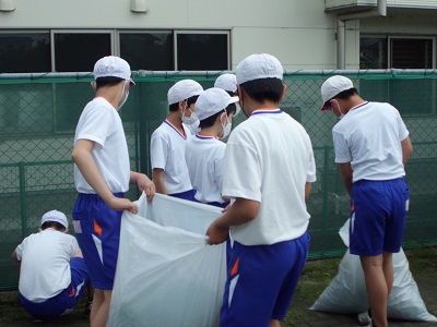 6年生はプールサイドの草むしりとプール内のブラシ掃除に分かれて行いました。