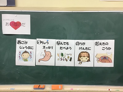 「かむことは『あいなのだ』」の合い言葉を使い、かむことの大切さを学びました。