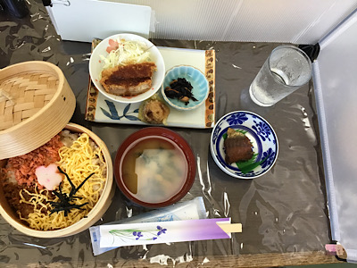 昼食は、わっぱ飯と饅頭の天ぷらやソースかつなど郷土料理が出ました。