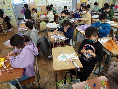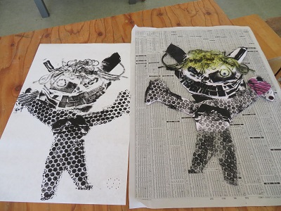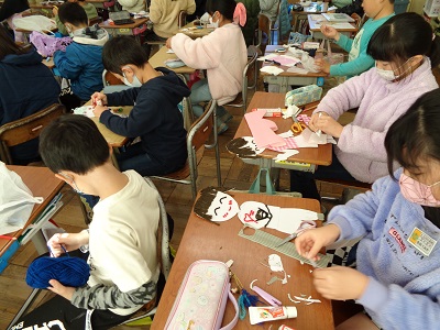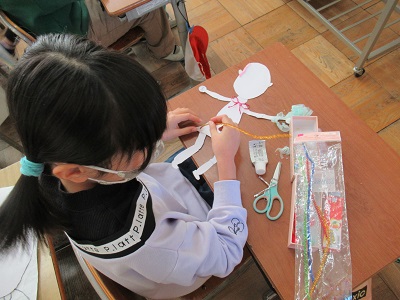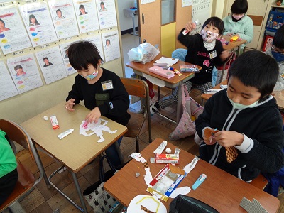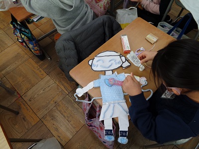 画用紙で頭、腕、手、足などのパーツを作り、その上にモールや毛糸、ボタンやプチプチなど自分で用意した材料を付けていきます。