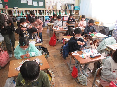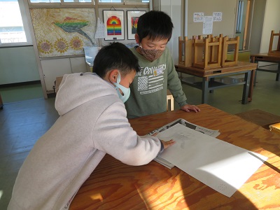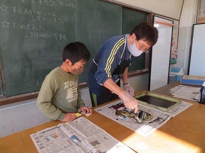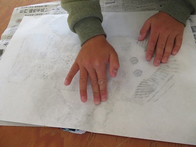 先生にインクを乗せてもらった後は、友達同士で教え合って刷りました。