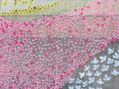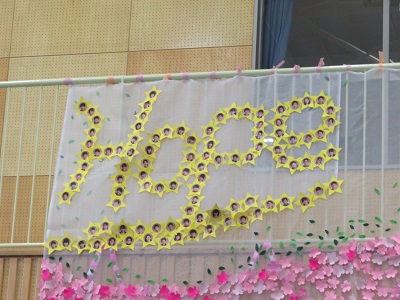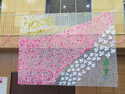 卒業式の時、体育館の南側の壁に卒業生が作った素敵な飾りが飾られていました。