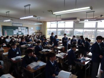 全校生徒で校則について考えるパネルディスカッションを行いました。学校運営協議会の会長様にもお越しいただきご意見をいただきました。