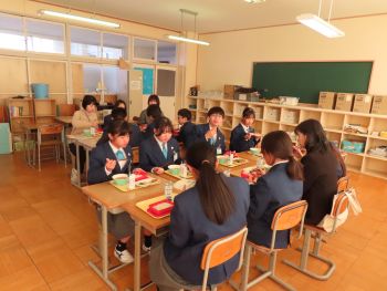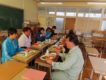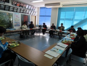商工会、教育委員会、給食センターの皆さんを迎えて会食を行いました。会食しながら給食委員がいくつかの質問をして答えていただきました。