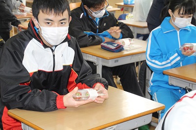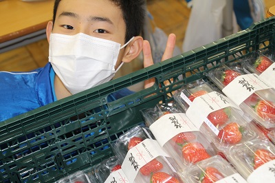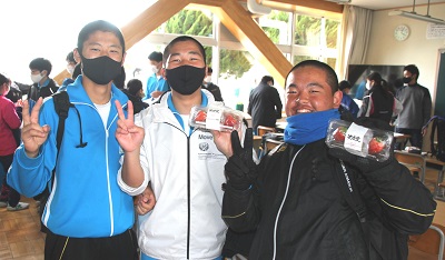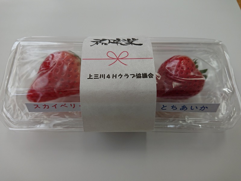 本日、町内の若手農業者でつくる上三川4Hクラブ協議会の方々から中学3年生にイチゴをいただきました。「とちあいか」と「スカイベリー」と「とちおとめ」の3種類を楽しめるパックです。
