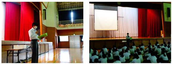 本校では生徒主体の校則作りを目指し、生徒会本部役員が中核となり、教員との協議を重ねながら、よりよい校則を検討しています。集会では生徒会副会長から全校生徒に向けて、改正案についての説明がありました。後日、生徒総会で議題として提案される予定です。
