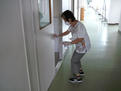 放課後の消毒作業を地域の方々が行ってくださっています。