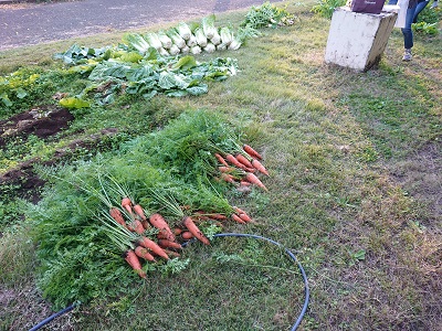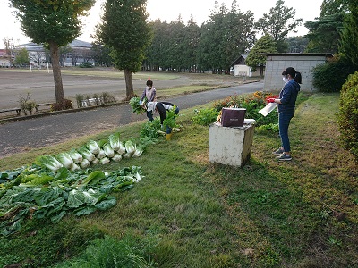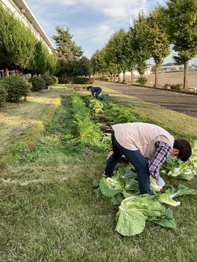 上三川中学校園芸部の方々が教室棟前の花壇で栽培していた白菜と大根、にんじんを収穫しました。立派に育ちました。