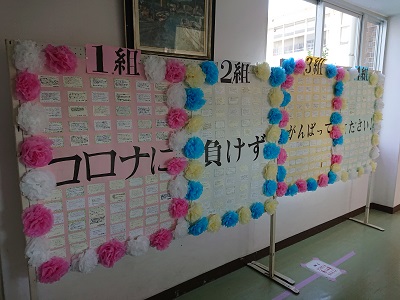 現在、昇降口には、1・2年生から3年生の先輩へのメッセージが飾られています。