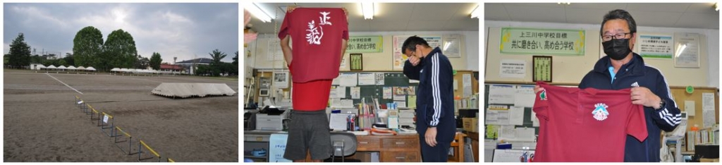 今年で最後の体育祭となる校長先生に、職員からスタッフポロシャツが贈呈されました(写真中央・右)。左胸には今年度登場した上三川中学校マスコットキャラクター「かみおりくん」が、右袖には校章がプリントされています。そして、バックには「正義」の文字が‼明日の体育祭でお披露目となります。注目してください‼