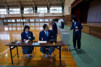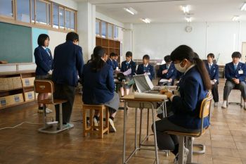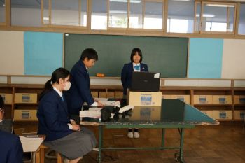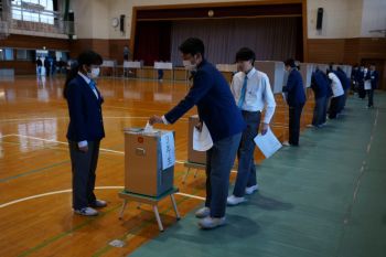 感染症の状況を踏まえ、オンラインで生徒会役員の意見発表会を行い、その後体育館で投票を行いました。