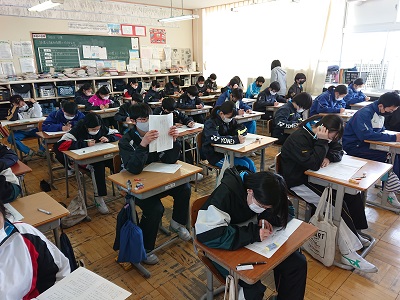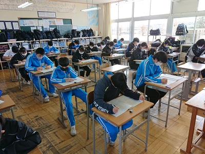 本日、3年生はそれぞれの希望進路に向けて、県立高等学校一般選抜(入試)の学力検査を行いました。