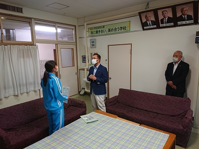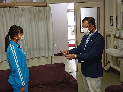 本日、星野町長と氷室教育長が来校され、先月「困っている人の役に立てば」との思いで作り続けた75枚のマスクを町に寄贈した、片柳さんとお母様に対して感謝状が贈呈されました。