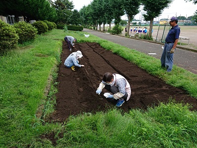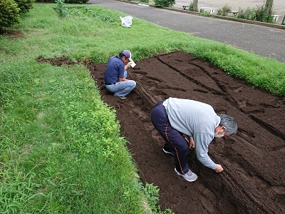 学校支援コーディネーターの方と学校支援ボランティアの方々で校庭ににんじんの種を植えました。
