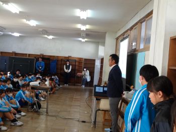 1学年が総合的な学習の時間に「地域から学ぶ」の学習の一環として、トマト農家の方を講師に招いて、食に関する講話を行いました。
