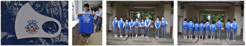 上三川中学校のマスコットキャラクター「かみおりくん」がプリントされたマスクとビブスを作りました。生徒会本部役員がさまざまなイベントで着用いたします。