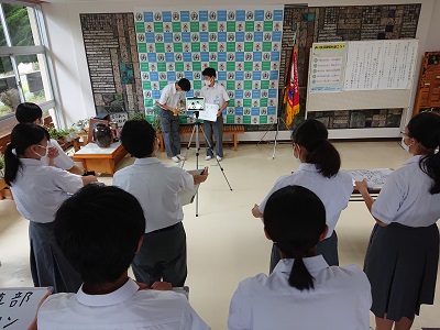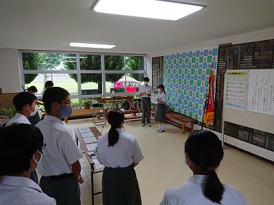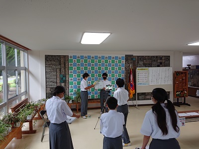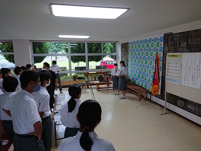今年度の生徒会のスローガンの発表と宇河総体大会等に向けて各部の部長の意気込みをインタビュー形式で確認しました。
