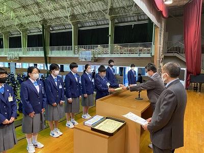 本日、表彰式・冬季休業前集会を体育館で行いました。