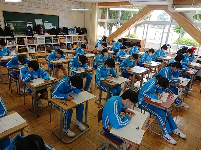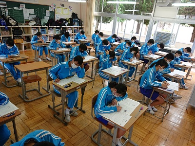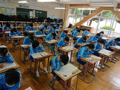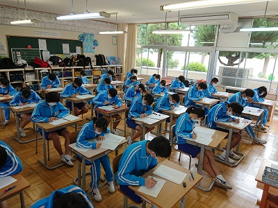 現在4時間目、理科のテストです。真剣に取り組んでいます。