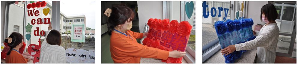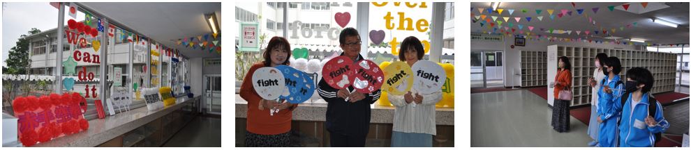 上三川中学校の昇降口は、学校行事や季節の飾りつけを図書ボランティアの皆様が行っています。今日は、6月11日に実施される体育祭に向けての飾りつけをしていただきました。