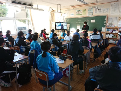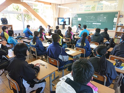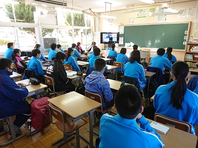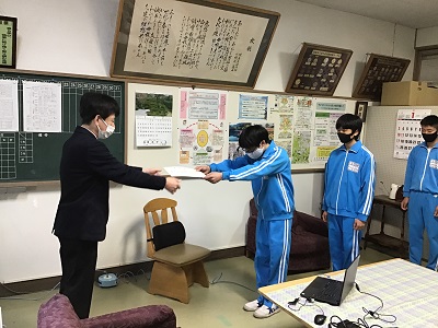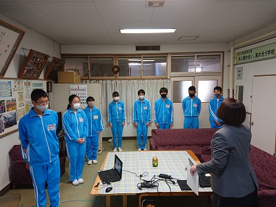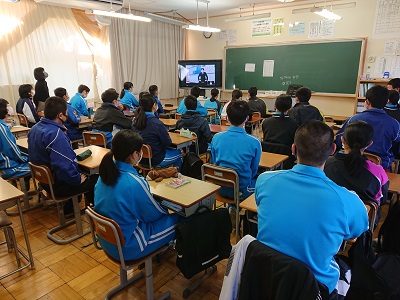 生徒会役員の認証と校長先生の話をオンライン中継で行いました。