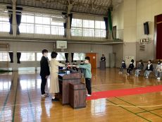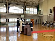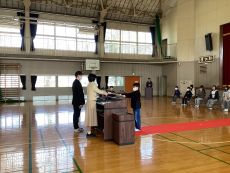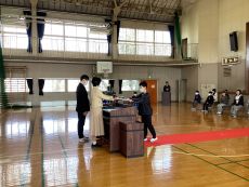 本日の卒業式予行の後に、善行児童表彰と卒業記念品贈呈を行いました。善行賞は、模範となる生活態度や言動の児童に贈られました。卒業記念品は、上三川町から卒業証書ファイルと英和辞典を、PTAから図書カードをいただきました。受賞児童や代表児童は、立派な態度で賞状や記念品を受け取っていました。