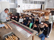 2時間目に4年生を3,4時間目に3年生を指導してくださいました。ボランティアの大工さんから、のこぎりの持ち方や使い方を丁寧に教えていただいたり、角材を切る際に補助していただいたりしました。