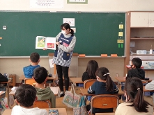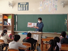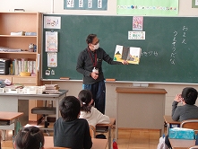 校長先生、教頭先生、教務主任の先生、保健室の先生、TT指導の先生の5人による読み聞かせです。