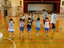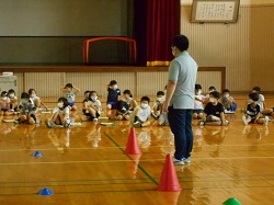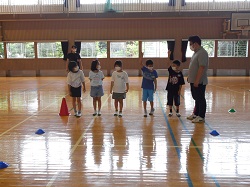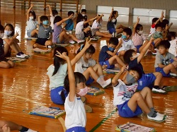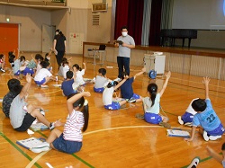 写真は低学年の様子です。体育館で、安全な歩き方のクイズなどに答えながら学習した後、模擬道路を使って、歩き方の練習をしました。