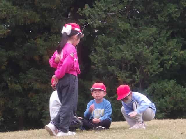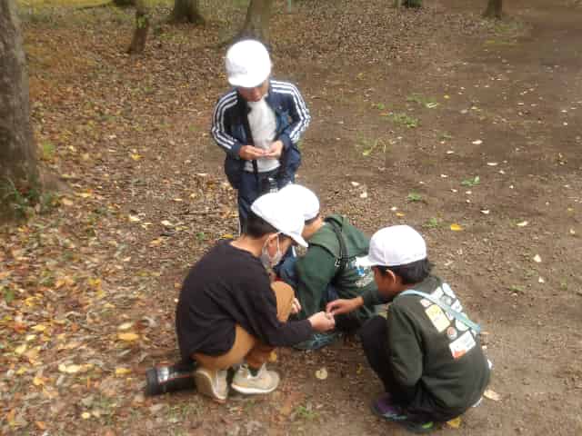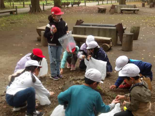 公園内では、色とりどりの落ち葉やさまざまな形の木の実を見つけて、児童たちは夢中になって集めていました。グループ活動では、見つけたものを見せ合ったり、自然の中での気付きや発見を話し合ったりする姿が見られました。