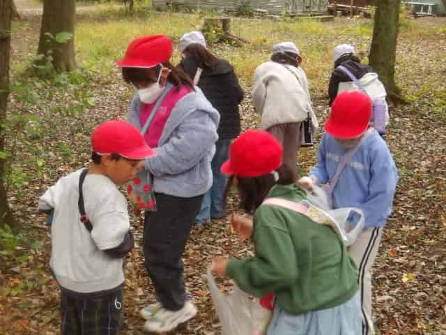 秋の自然にふれながら、落ち葉や木の実(どんぐり・松ぼっくりなど)の採集を行いました。