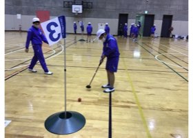 準備運動をしてから体をほぐし、室内パークゴルフを行いました。ホールインするのは、なかなか難しかったようです。