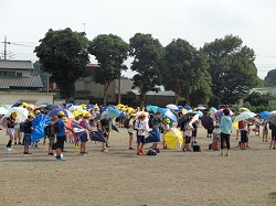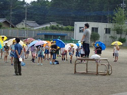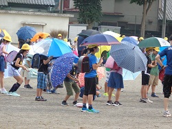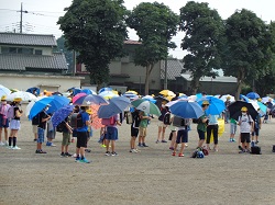 保護者の皆様には7月17日付の通知でお知らせしたとおり、7月27日より傘を差しての登下校が始まります。そのために、集団登下校中の傘の開き方・閉じ方や、途中での水分補給の仕方、安全な差し方などを学習しました。