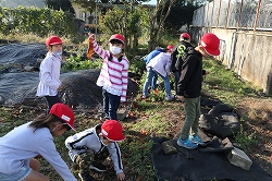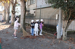 5,6年生は、竹箒や熊手で落ち葉を集める。また、やり方を中学年に教える。