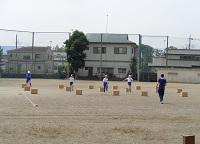 下の写真は6年生の体育(校長先生の指導による段ボール箱を利用したハードル走)と