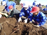業間から3校時にかけて、1年生と6年生がさつまいもの収穫を行いました。