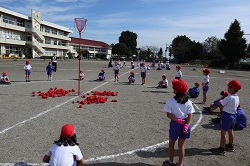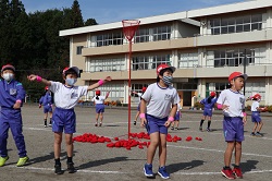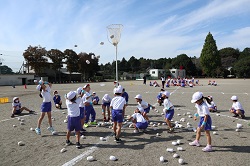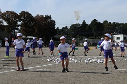今日は、団体競技の玉入れで、実際に紅白のかごに球を入れる練習をしました。