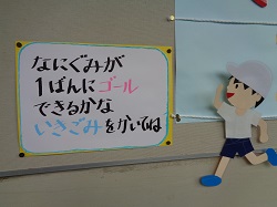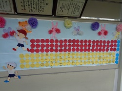 また、職員室前の廊下には、図書ボランティアさんが作ってくださった、赤白対抗の掲示物があります。運動会への意気込みを子供たちがカードに書いて貼り付けてある物です。カードの枚数では、今のところ白組がちょっとリードしているようです。来校された際はぜひご覧ください。