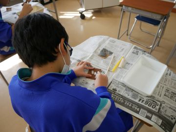 埋蔵文化財センターの職員の方にご来校いただき、勾玉作りをしました。