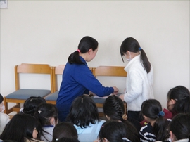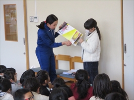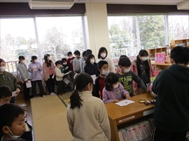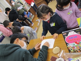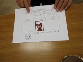 業間に,第2回の読み聞かせを行いました。昨日参加し,今回で2つ目のスタンプを押してもらった児童は,図書のマスコットキャラ「みなくまちゃん」のしおりをもらいました。