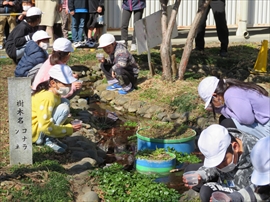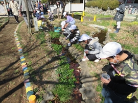 3校時,3年生が,総合的な学習の時間でホタルの放流をしました。一人一人がホタルが元気に育つように願いを込めてビオトープに放ちました。