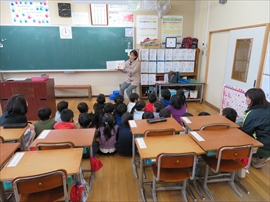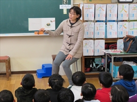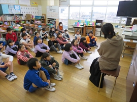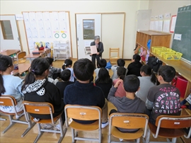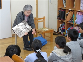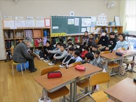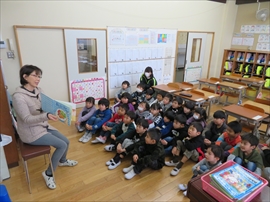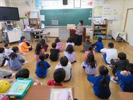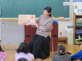朝の活動に時間に,1~3年生が,絵本の朗読ししてもらいました。毎回,図書ボランティアの方々が,季節や学年の学習状況,その時々の社会情勢などから厳選しています。