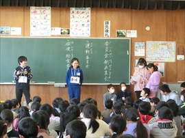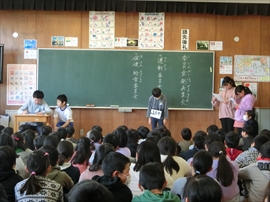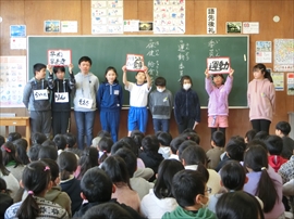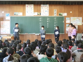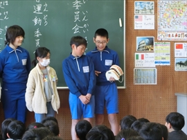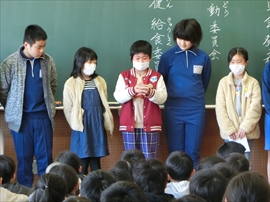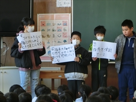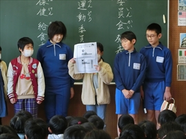 業間に,委員会発表を行いました。今回の委員会は,運動委員会と保健給食委員会でした。