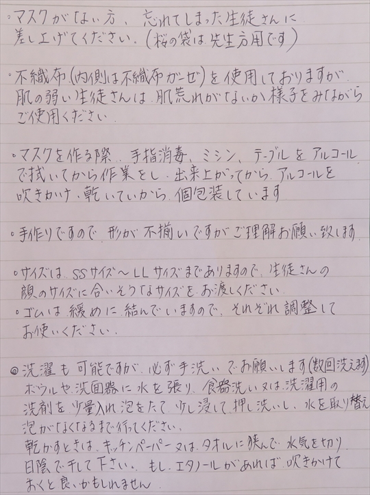 地域の方から子供たちへと,手作りの不織布マスクを寄贈していただきました。学校応援団として,本校のサポートもしていただいており,本当にありがたいことです。大切に使わせていただきます。