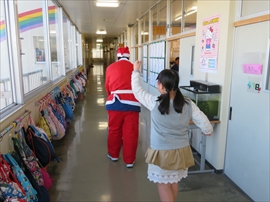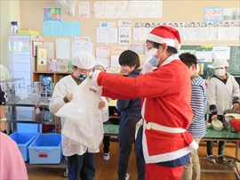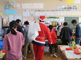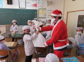 給食前に,サンタ一人が,再び来校しました。1年生から6年生まで,プレゼントを配っていきました。今,こどもたちからお願いされたプレゼントで,手作りできないものやAmazonでポチれなかったものを,おもちゃ屋などを回って調達中で,休憩なしのブラックな状態の中,明南小のこどもたちのためにわざわざ来てくださいました。サンタの仕事は,深夜夜明け前まで続くということです。