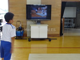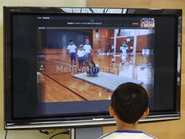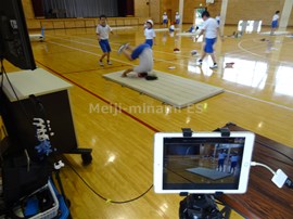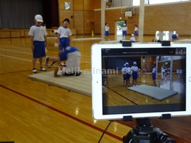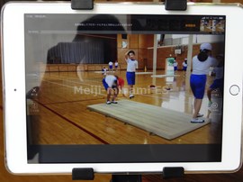 体育のマット運動では,iPadで遅延再生のアプリを使って,自分の動きを映像で見ながら技の修正をしています。一番修正が必要なのは,自分の体重を手で支えられないことでした。